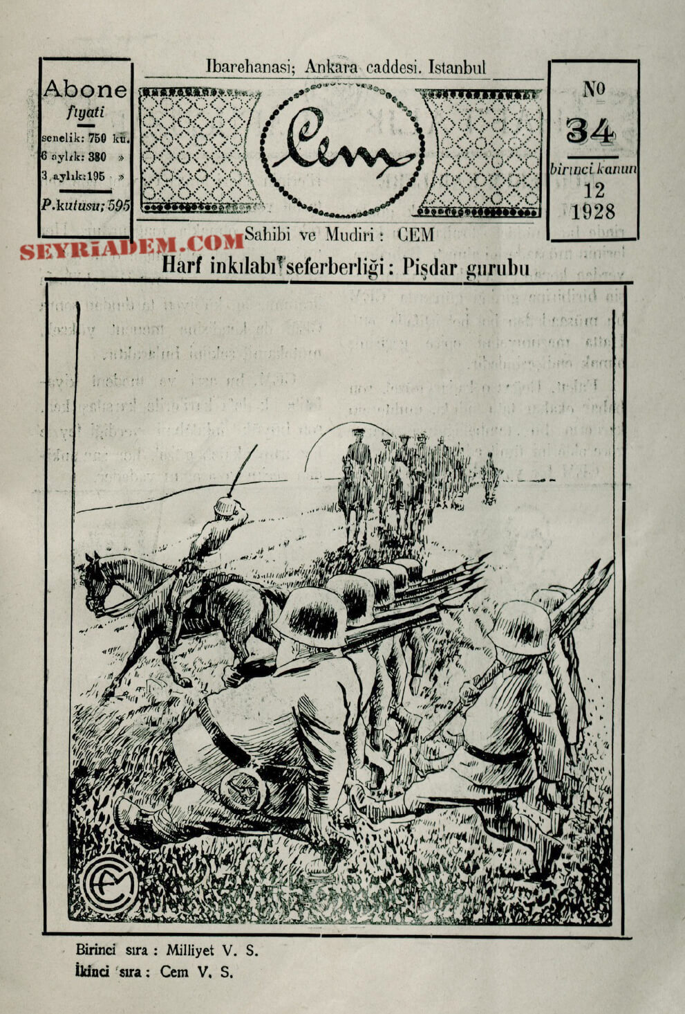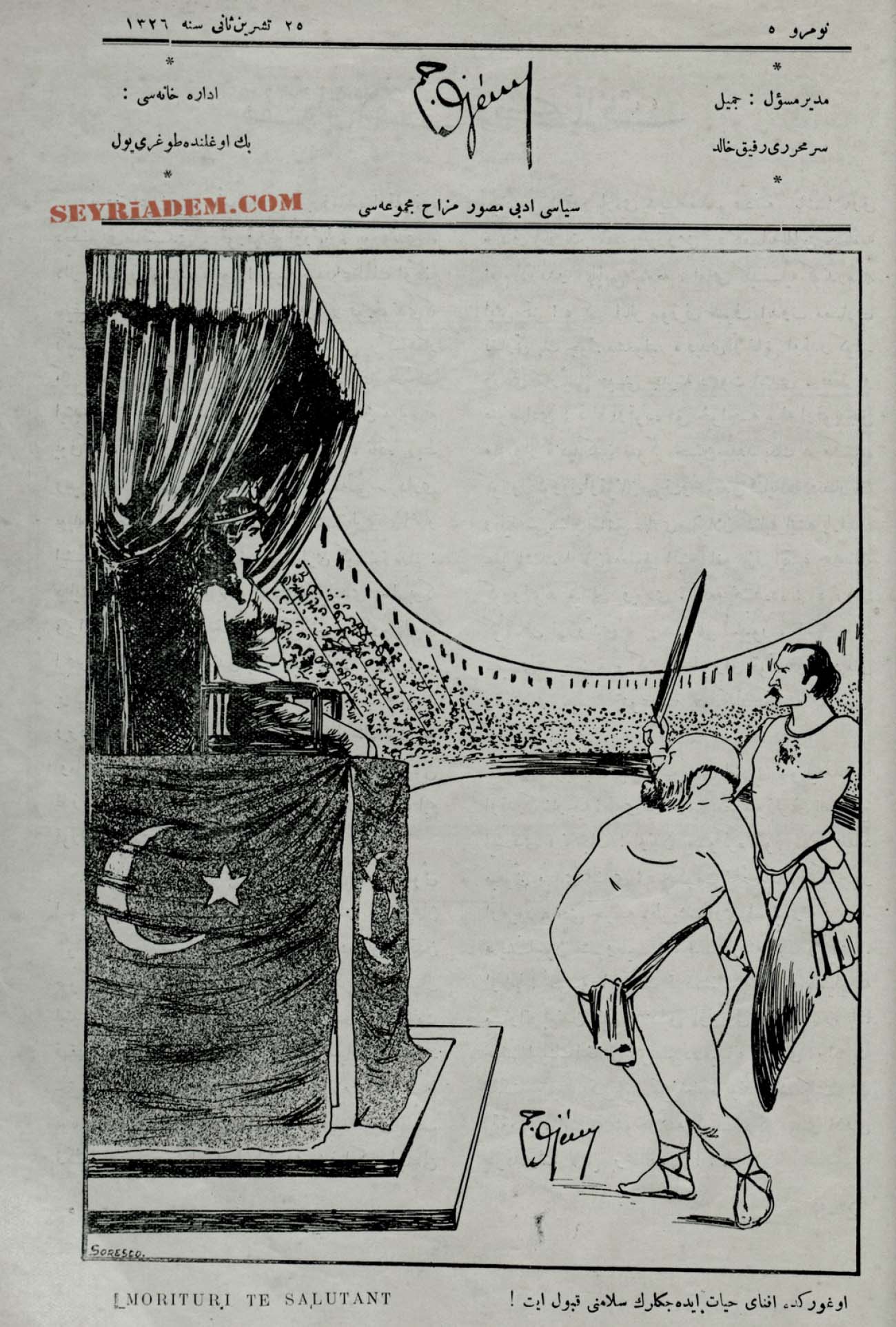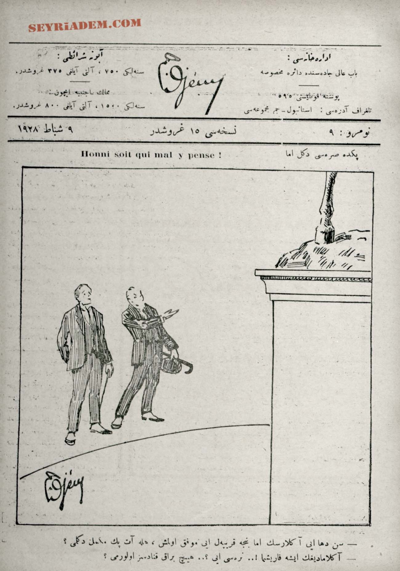 Perşembe günleri neşrolunur, siyasi, edebi, musavver mizah mecmuasıdır.” Müdür-i mes’ul: Cemil (Cem), Sermuharriri: Refik Halit (Karay), İstanbul. Sanayi-i Nefise Matbaası, İktisat Matbaası, Terakki Matbaası, Matbaa-i İhsan ve Şükerası. 20,5×28 (Haftalık). İttihad ve Terakki Partisinin baskılarına dayanamayıp kendisini kapatmıştır. Daha sonra 1912’de Hürriyet ve İtilaf İtilaf Partisi iktidara gelmesiyle 33. sayıdan tekrar yayınına başlamıştır. 10 Kasım 1910 – 12 Ekim 1912 tarihleri arasında toplam 43 sayı yayımlanmıştır.