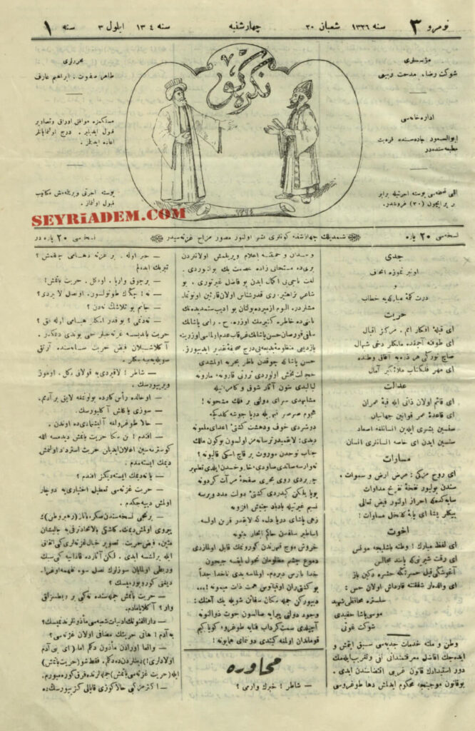 “Şimdilik haftada bir def’a olarak Çarşamba günleri neşrolunur, musavver mizah gazetesidir.” Müessisleri: Şevket Rıza, Mithat Rebii. Muharirleri: Tahir Safvet (Tâhirü’l-Mevlevî), İbrahim Arif. İstanbul, Karabet Matbaası. (Haftalık). II. Meşrutiyetin ilanından hemen sonra yayımlanan mizah dergilerindendir. 31 Ağustos ila 7 Ekim 1908 tarihleri arasında 5 sayı yayımlanmıştır. Daha sonra 1909 yılında Nekregu ile Pişekar adında tekrar yayımlanacaktır. Nekregu kelime anlamı olarak, beklenmeyen hoş ve şaşırtıcı sözler söyleyen, güldürücü hikâyeler anlatan kişidir.